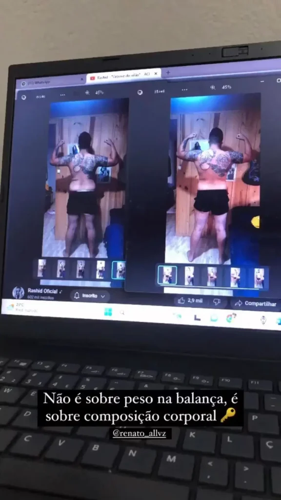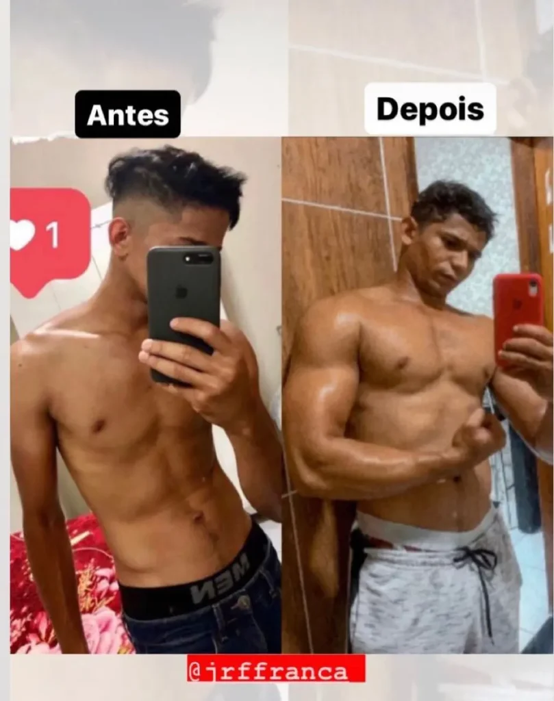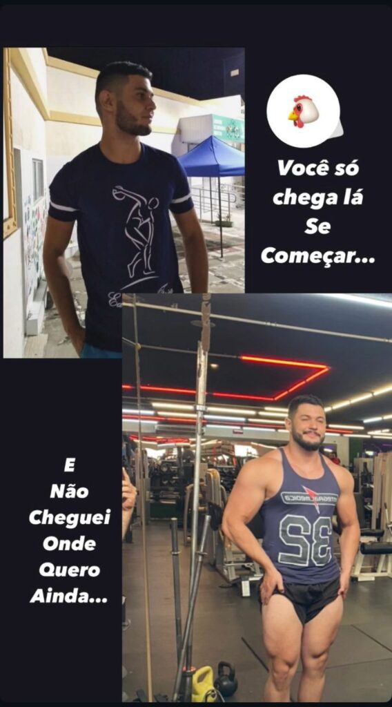 Durante esse período, também montei pesos de cimento para continuar treinando e manter uma rotina de exercícios durante o isolamento. Ao final da pandemia, eu estava pesando 75 kg e pude retornar à academia, onde consegui aumentar a carga e obter ainda mais resultados. Desde então, nunca parei de treinar e sempre cuidei da minha rotina de treino, alimentação e descanso. Hoje, estou com 88 kg, quase o dobro do meu peso anterior, e me sinto muito mais forte e volumoso. As pessoas muitas vezes nem me reconhecem, pois ficam surpresas com minha transformação.